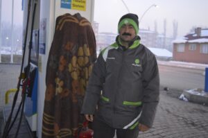 Akaryakıt istasyonunun otomasyonunu soğuktan korumak için bu yönteme başvurduklarını dile getiren Oğlu: “Hava çok soğuk olduğundan dolayı pompalara battaniye sardık. Memleketimize kış ve soğuk hava geri geldi. Soğuk hava nedeni ile pompalar ddonuyor. Bizde donmaya karşı battaniye sararak önlem almaya çalışıyoruz” dedi.