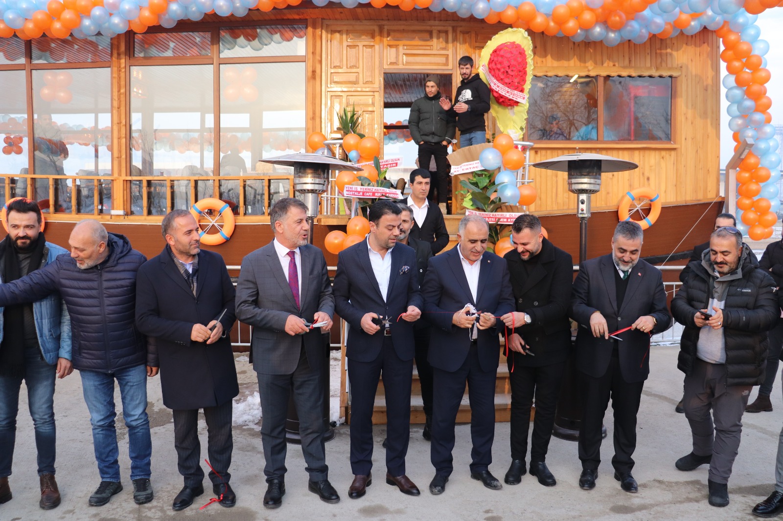 Denizi olmayan Ağrı’da, 7 metre genişlik 21 metre uzunluğa sahip dev balıkçı teknesinden yapılan kafe ve restorandın açılışı yapıldı