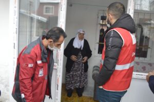 Ağrı Kızılay Şube Başkanlığı’nın gönüllü gençleri, hafta sonu sokağa çıkma kısıtlamalarında evlerinden çıkamayan yaşlı ve bakıma muhtaç vatandaşları ziyaret ederek gıda kolisi ve çeşitli meyveler dağıttı