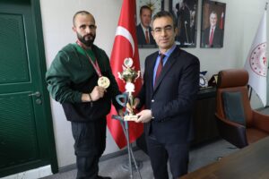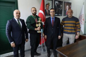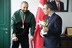 Başarılı azimli sporcu Halit Durak, antrenörü Çetin Demir ve Spor Hizmetleri Cemil Budak ile beraber Gençlik ve Spor İl Müdürü Fedai Din’i ziyaret etti. İl Müdürü Din; Türkiye şampiyonu olan kardeşimiz Halit’in bu azmi bizleri çok mutlu etti. İl Müdürlüğü olarak bedensel engelli sporcularımıza desteğimiz devam edecek. Sporcumuzu ve antrenörü Çetin Demir’i tebrik eder, başarılarının devamını diliyorum dedi.
